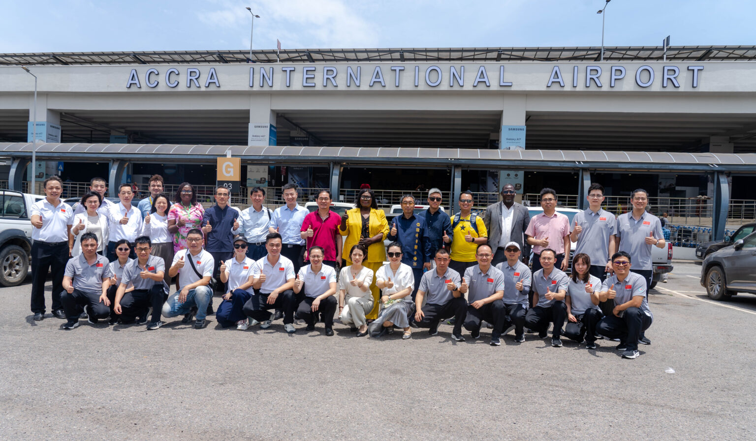 The 15th China Medical Team steps off the aircraft at the Accra International Airport. The team members, carrying their luggage and medical supplies, arrive in Accra on March 24, 2026, marking the beginning of their one-year medical mission in Ghana.
